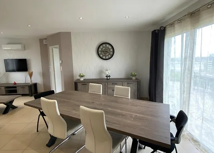 Az "La Bressolaise" Ideal Familles, Piscine, Calme villa magába foglal étkezőt és kültéri étkezőhelyet elektromos vízforralóval, mosogatógéppel és hűtővel.